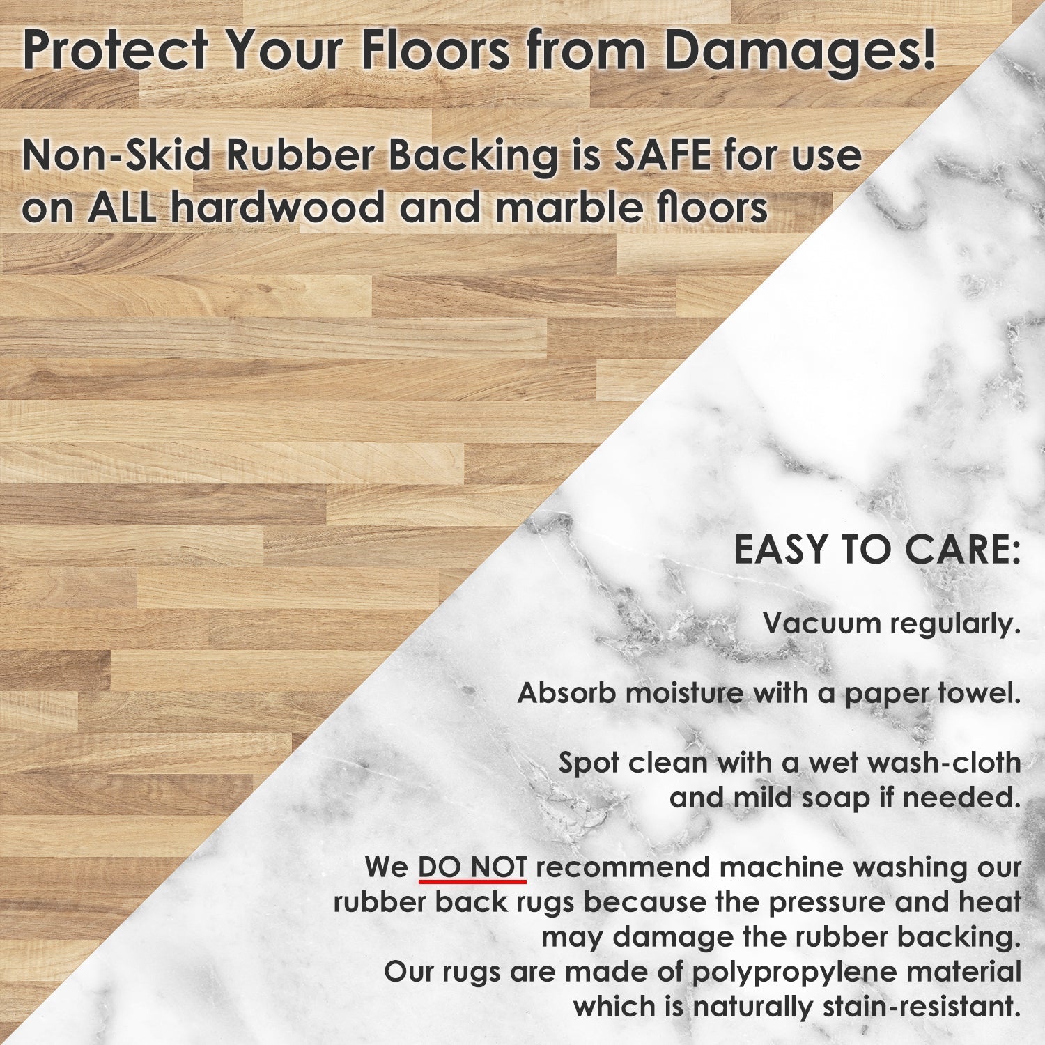 Our premium quality non-slip rubber backing is safe to use on hardwood, laminate, vinyl, marble, and tile flooring. Our rubber backed runner rugs help your kids & pets safely walk on slippery hallways, stairs, kitchens and living room floors while protecting it from high traffic usage. Efficient low-pile does not add bulk to your floor and allow for perfect placement under furniture and doors as well as on stairs. Proudly custom made in the USA with imported materials.